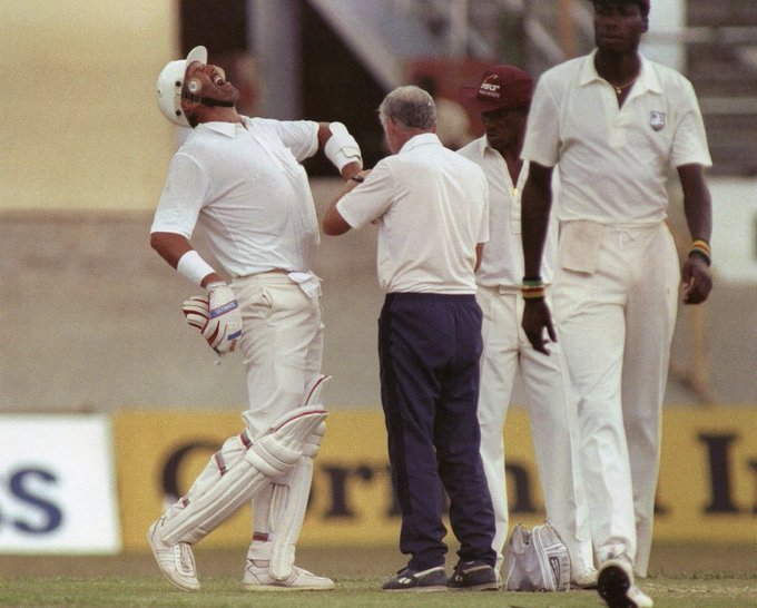 So, does this hurt? The pain clearly shows as Graham Gooch's broken hand is treated by the England doctor, 3rd Test, Port-of-Spain, March 28, 1990. The injury ruled him out of the rest of the series. The bowler was Ezra Moseley, making his Test debut. pic.twitter.com/gmVa6jnpvo