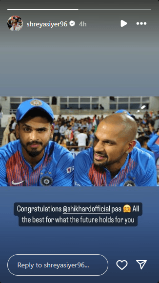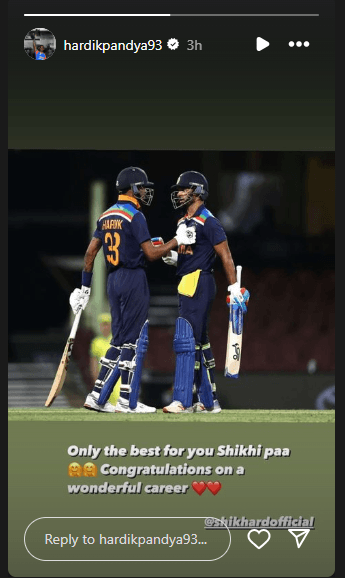 भारतीय टीम के स्टार ऑलराउंडर हार्दिक पांड्या ने भी धवन को शुभकामनाएं देते हुए लिखा, ‘शिखी पा, आपके लिए ढेर सारी शुभकामनाएं. शानदार करियर के लिए बधाई.’ एक अन्य प्रतिभाशाली भारतीय बल्लेबाज श्रेयस अय्यर ने भी इसी तरह की भावनाएं व्यक्त करते हुए अपने आधिकारिक इंस्टाग्राम प्रोफाइल पर एक स्टोरी पोस्ट की, जिसमें लिखा, ‘बधाई हो @shikhardofficial पा. भविष्य के लिए आपको ढेर सारी शुभकामनाएं.’