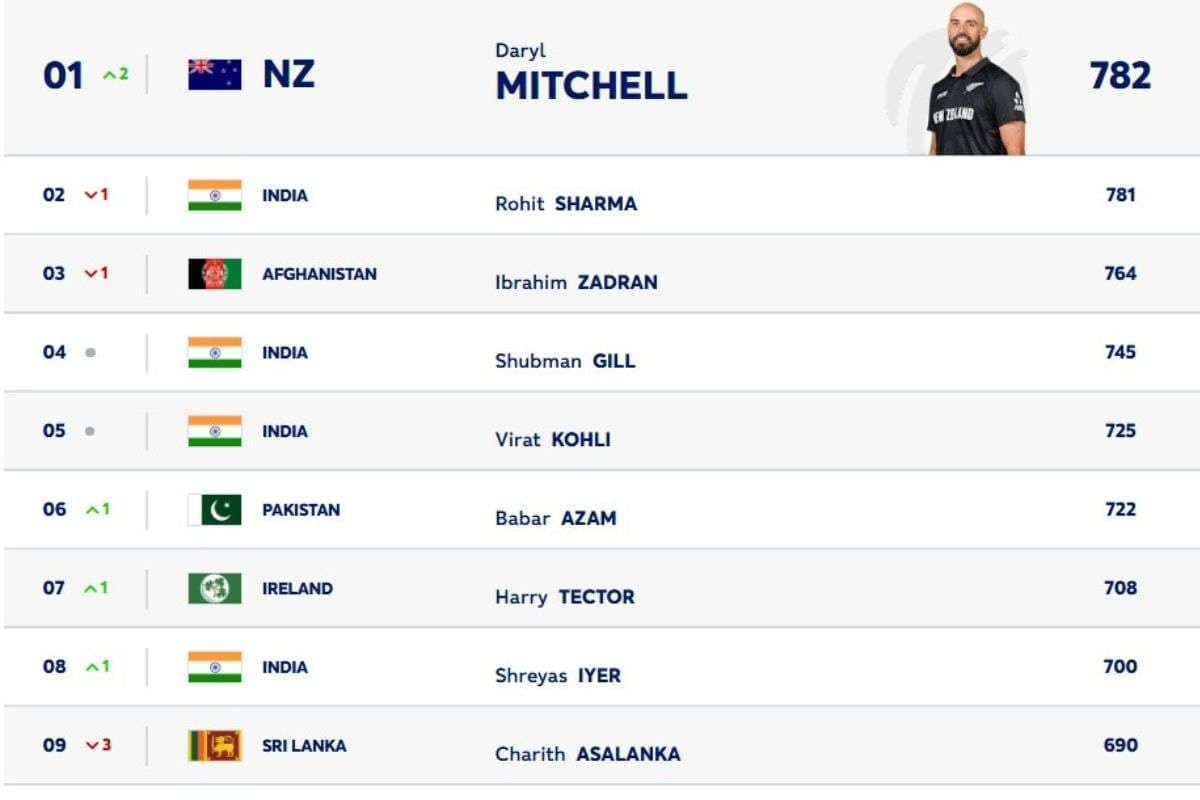 ICC Rankings: आईसीसी वनडे बल्लेबाजी रैंकिंग में इस सप्ताह बड़ा उलटफेर देखा गया. न्यूजीलैंड के डेरिल मिचेल शानदार प्रदर्शन के दम पर पहली बार नंबर 1 बन गए, जबकि रोहित शर्मा एक स्थान फिसलकर दूसरे नंबर पर पहुंच गए. इब्राहिम जादरान की रैंकिंग घटी, वहीं बाबर आजम और श्रेयस अय्यर को फायदा मिला.
