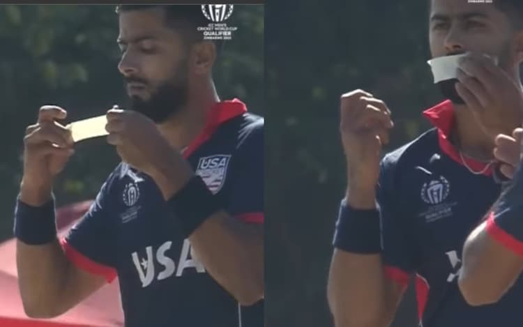 दअरसल, अली खान ने नीदरलैंड की पारी के तीसरे ओवर की आखिरी गेंद पर ओपनर बल्लेबाज विक्रमजीत सिंह को कॉटन बोल्ड किया. हालांकि अली विक्रमजीत का कैच एक प्रयास में नहीं पकड़ सके थे लेकिन किसी तरह वह सफल रहे. इसके बाद अली खान ने जश्न मनाते हुए अपनी ट्राउजर की जेब से एक सफेद रंग का टेप निकाला और अपने मुंह पर लगा लिया. हालांकि, फैंस अली खान के इस तरह के जश्न मनाने के पीछे का कारण नहीं समझ पा रहे हैं. इसका वीडियो सोशल मीडिया पर तेजी से वायरल हो रहा है.
