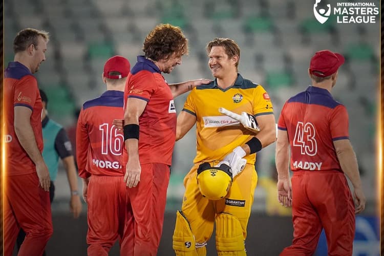 इंग्लैंड मास्टर्स (England Masters) ने टॉस जीतकर पहले बल्लेबाजी करने का फैसला किया और इयोन मोर्गन और टिम एम्ब्रोस की विस्फोटक पारियों की बदौलत बड़ा स्कोर खड़ा किया. फिल मस्टर्ड (17 गेंदों पर 17 रन) ने मोर्गन के साथ मिलकर पहले विकेट के लिए 76 रन की साझेदारी की. मोर्गन ने 27 गेंदों पर 64 रन बनाए, जिसमें पांच चौके और पांच छक्के शामिल थे. England vs Australia.
