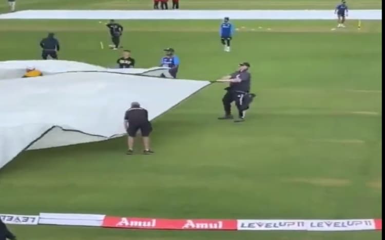 IND vs NZ 2nd ODI: भारत और न्यूजीलैंड के बीच तीन वनडे मैचों की सीरीज का दूसरा मुकाबला बारिश के कारण रद्द हो गया. हैमिल्टन में लगातार बारिश होने के चलते इस मैच में सिर्फ 12.5 ओवर का खेल हो सका. टीम इंडिया ने 12.5 ओवरों में एक विकेट के नुकसान पर 89 रन बना लिए थे. वहीं इस मैच में कप्तान शिखर धवन ने प्लेइंग इलेवन में बदलाव करते हुए संजू सैमसन (Sanju Samson) की जगह दीपक हुडा को मौका दिया. लेकिन संजू ने इस मैच में खेले बगैर ही फैंस का दिल लिया. दरअसल, उनका एक वीडियो सोशल मीडिया पर वायरल हो रहा है. जिसमें वह पिच कवर करने में ग्राउंड स्टॉफ की मदद कर रहे हैं.