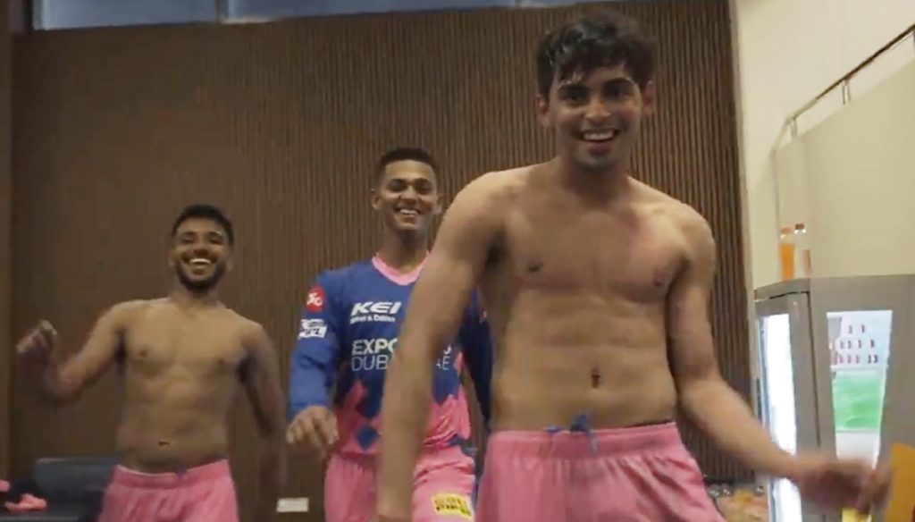 IPL 2021: आखिरी 6 गेंद में कमाल करने वाले कार्तिक त्यागी ने ड्रेसिंग रूम में किया शर्टलेस डांस, देखें VIDEO