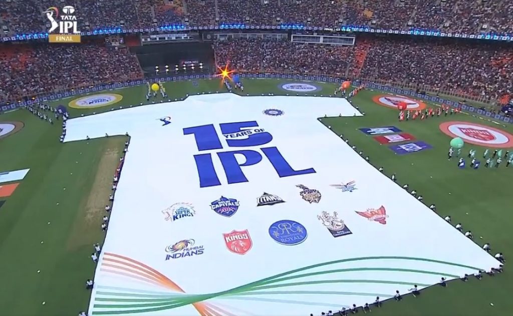 फाइनल मुकाबला शुरू होने से पहले टीवी स्क्रीन पर एक विशालआईपीएल जर्सी को दिखाया गया. दुनिया के सबसे बड़े नरेंद्र मोदी स्टेडियम में जब जर्सी को फैलाया गया, तो लगभग पूरा मैदान उस विशाल जर्सी ने कवर कर लिया.