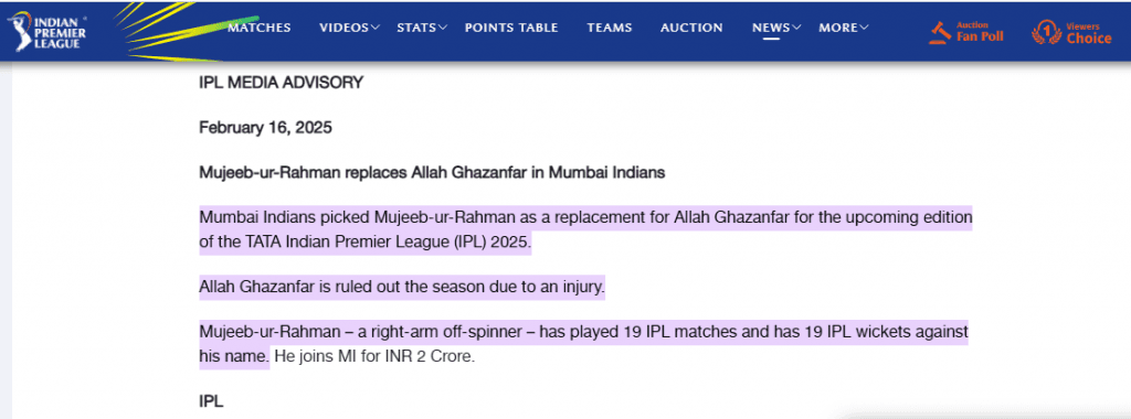 आईपीएल की आधिकारिक वेबसाइट पर जारी बयान में कहा कि मुंबई इंडियंस ने टाटा इंडियन प्रीमियर लीग (आईपीएल) 2025 के आगामी संस्करण के लिए अल्लाह गजनफर की जगह मुजीब-उर-रहमान को चुना. दाएं हाथ के ऑफ स्पिनर मुजीब-उर-रहमान ने 19 आईपीएल मैच खेले हैं और उनके नाम 19 आईपीएल विकेट दर्ज हैं. वह 2 करोड़ रुपये में एमआई में शामिल हुए हैं. Mujeeb Ur Rahman replaces Allah Ghazanfar.