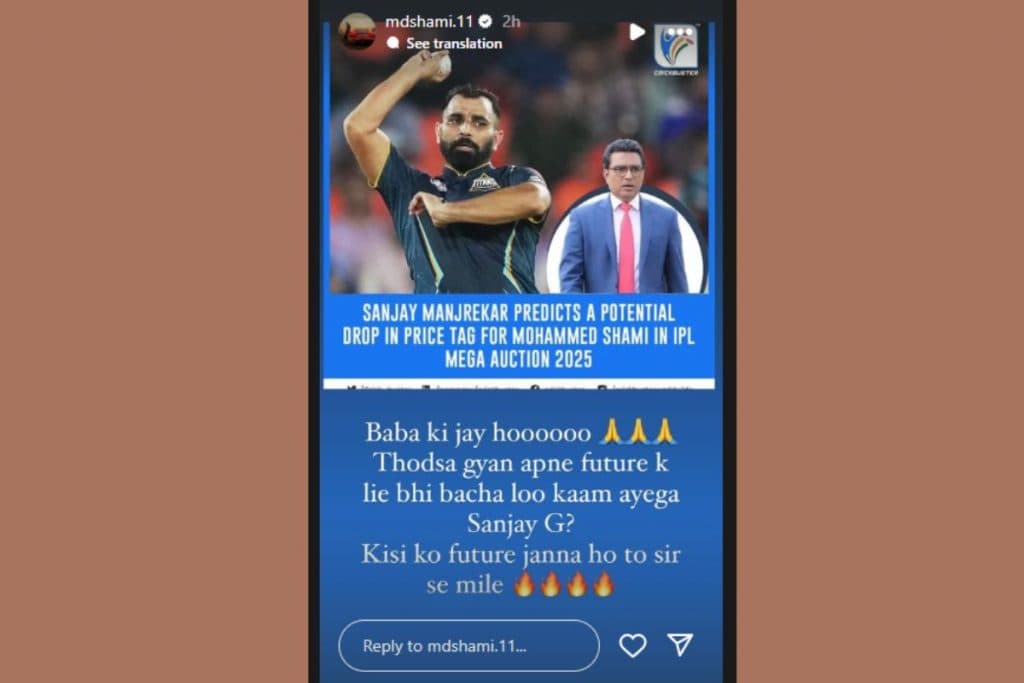 संजय मांजरेकर की इस टिप्पणी पर शमी ने इंस्टाग्राम पर जवाब दिया. अपने इंस्टाग्राम स्टेटस पर शमी जवाब देते हुए कहा, बाबा की जय हो, थोड़ा ज्ञान अपने फ्यूचर के लिए भी बचा लो संजय जी काम आएगा. किसी को भी फ्यूचर जानना हो तो सर से मिले. आपको बता दें कि शमी चोट की वजह से टीम से बाहर चल रहे हैं. उन्हें ऑस्ट्रेलिया के खिलाफ भारतीय टीम का हिस्सा नहीं बनाया गया है. शमी पिछले सीजन में गुजरात टाइटंस के साथ जुड़े हुए थे. उन्हें गुजरात ने रिटेन नहीं किया है.
