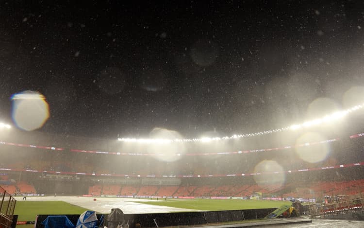 एक्यूवेदर के अनुसार, मैच से ठीक पहले (शाम 5 और 6 बजे) बादल छाए रहने की संभावना है, लेकिन शाम को स्थिति में सुधार होने की उम्मीद है. शाम 7 बजे तक आसमान साफ होने की उम्मीद है. दिन में बारिश की कोई संभावना नहीं है, लेकिन शाम में हल्की बारिश की होने की संभावना जताई जा रही है. बता दें कि गुजरात में भारी बारिश को लेकर अलर्ट जारी किया गया है. ऐसे में फैंस को एक बार फिर निराशा हाथ लग सकती है.