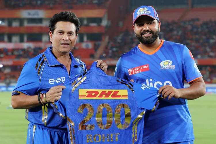 मुंबई इंडियंस की ओर से 200वां मैच खेलने पर रोहित शर्मा को भारत रत्न सचिन तेंदुलकर ने खास तोहफा दिया. सचिन ने रोहित को खास जर्सी देकर सम्मानित किया. जर्सी में 200 लिखा हुआ है. सचिन से खास तोहफा पाकर रोहित शर्मा खुश नजर आये.