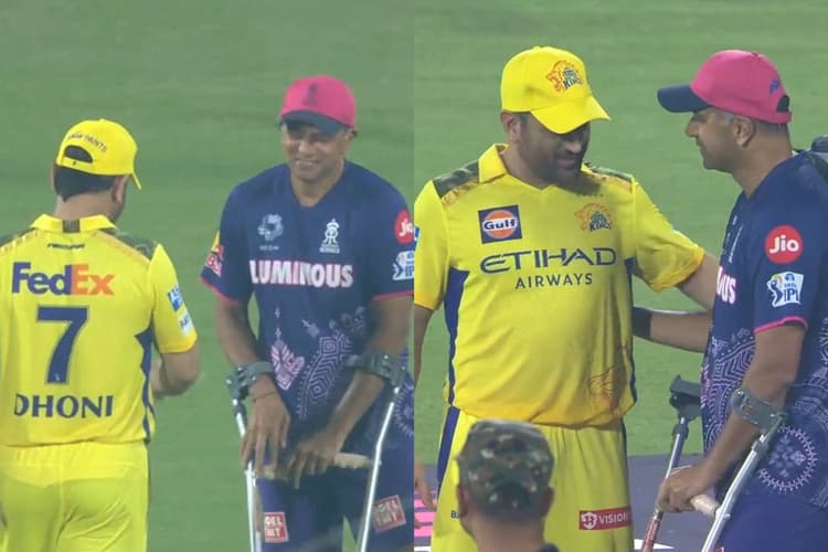 कड़े मुकाबले के बाद एक ऐसा भावनात्मक पल सामने आया जिसने भारतीय क्रिकेट प्रशंसकों का दिल छू लिया. हार के बावजूद, CSK के दिग्गज खिलाड़ी एमएस धोनी राजस्थान रॉयल्स के मुख्य कोच राहुल द्रविड़ से मिलने पहुंचे. पैर की चोट के कारण बैसाखी के सहारे चलने के बावजूद द्रविड़ मैदान पर उतरे. उनको देखकर धोनी ने न सिर्फ द्रविड़ को गले लगाया, बल्कि दोनों ने कुछ हल्के-फुल्के पल भी साझा किए. Rahul Dravid on Crutches.