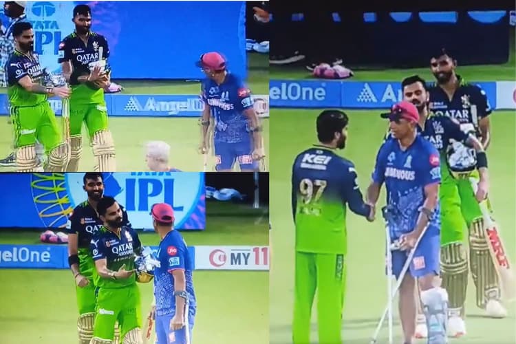 IPL 2025 Rahul Dravid on Crutches Meet up with Players deferred Virat’s Appeal: रॉयल चैलेंजर्स बेंगलुरु (RCB) ने रविवार शाम जयपुर में खेले गए मुकाबले में राजस्थान रॉयल्स (RR) को हराकर एक बार फिर जीत की राह पकड़ ली. इस जीत के साथ RCB ने आईपीएल 2025 अंक तालिका में अपनी स्थिति को मजबूत किया और अब टीम के 6 में से 4 मुकाबलों में जीत दर्ज हो चुकी है. आईपीएल 2025 के 28वें मुकाबले में रॉयल चैलेंजर्स बेंगलुरु (RCB) ने राजस्थान रॉयल्स (RR) को नौ विकेट से करारी शिकस्त दी. इस मुकाबले के बाद बेंगलुरु के दिग्गज खिलाड़ी विराट कोहली ने फैंस का दिल जीत लिया, जब उन्होंने राजस्थान रॉयल्स के हेड कोच राहुल द्रविड़ से एक खास अपील की.