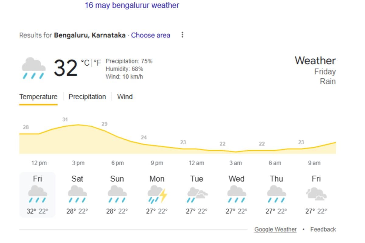 IPL 2025 Restart RCB vs KKR M. Chinnaswamy, Bengaluru Weather Report: रॉयल चैलेंजर्स बेंगलुरु (RCB) और कोलकाता नाइट राइडर्स (KKR) के बीच आईपीएल 2025 का 58वां मुकाबला खेला जाएगा. भारत पाकिस्तान के बीच सैन्य तनाव बढ़ने के कारण लीग को 10 दिन तक रोकना पड़ा था. अब जब यह दोबारा शुरू होने के लिए तैयार है, फैंस को फिर से निराशा हो सकती है. बारिश की आशंकाओं ने आईपीएल के दोबारा शुरू होने में बड़ा खलल डाला है. बेंगलुरु में फिलहाल कल 15 मई से बारिश हो रही है. 16 मई को भी 70 प्रतिशत बारिश की संभावना है और 17 मई को भी इसी तरह की संभवना व्यक्त की जा रही है.
