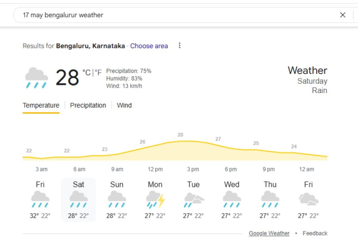 IPL 2025 Restart RCB vs KKR M. Chinnaswamy, Bengaluru Weather Report: आईपीएल 2025 का रीस्टार्ट RCB बनाम KKR मुकाबले से 17 मई को बेंगलुरु में होना है. भारत-पाक तनाव के कारण 10 दिन तक रुकी लीग फिर शुरू होने को तैयार है, लेकिन बारिश फैंस की उम्मीदों पर पानी फेर सकती है. बेंगलुरु में 15 से 17 मई तक लगातार बारिश की आशंका जताई गई है, जिससे मैच पर असर पड़ सकता है.