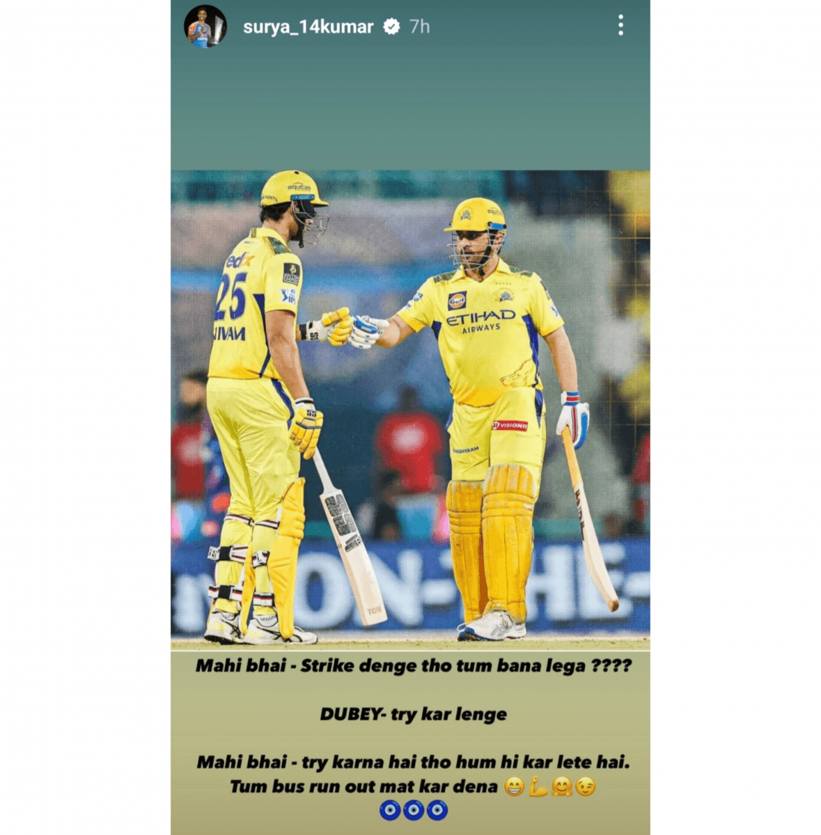 इस इंस्टाग्राम स्टोरी में सूर्यकुमार ने एमएस धोनी की बायोपिक ‘एमएस धोनी: द अनटोल्ड स्टोरी’ का एक मशहूर डायलॉग इस्तेमाल किया. फिल्म में यह सीन एक स्कूल टूर्नामेंट के दौरान का है, जब धोनी एक रन चेज में बैटिंग कर रहे होते हैं. सूर्या ने फिल्म के किरदारों की जगह असली जिंदगी के धोनी और दुबे को रखते हुए लिखा- “माही भाई- स्ट्राइक देगा तो तुम बना लेगा?