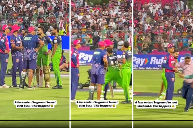 IPL 2025, Virat Kohli Cleverly Moves to avoid intruder: राजस्थान के सवाई मानसिंह स्टेडियम में रविवार को खेले गए आईपीएल 2025 मुकाबले में रॉयल चैलेंजर्स बेंगलुरु (RCB) ने राजस्थान रॉयल्स (RR) को 9 विकेट से करारी शिकस्त दी. इस जीत में विराट कोहली की नाबाद 62 रनों की पारी निर्णायक साबित हुई, जिससे बेंगलुरु की टीम ने 15 गेंद शेष रहते लक्ष्य हासिल कर लिया. मैच समाप्त होने के बाद विराट कोहली राजस्थान रॉयल्स के कोच राहुल द्रविड़ और विक्रम राठौर से बात कर रहे थे, तभी एक फैन मैदान पर घुस आया और सीधा विराट कोहली के पास पहुंच गया, लेकिन कोहली स्थिति को भांप गए और तुरंत वहां से हट गए. Rajasthan Royals vs Royal Challengers Bengaluru.