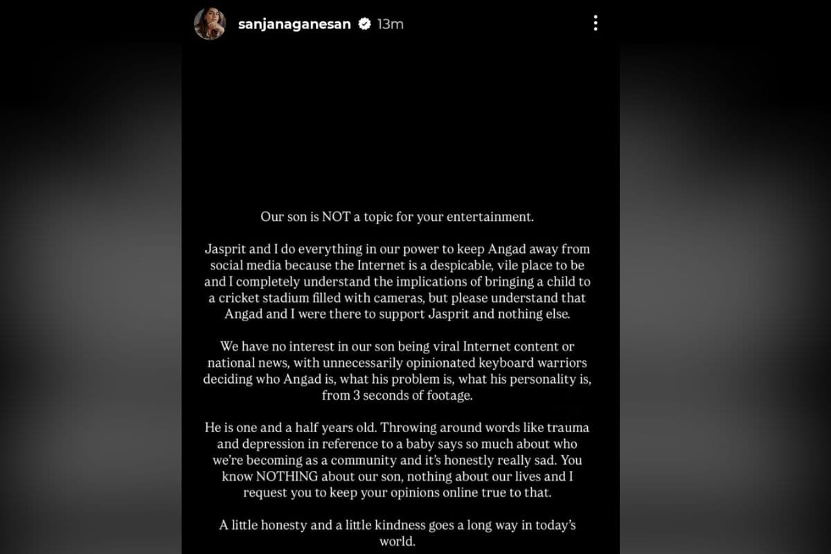 उन्होंने इंस्टाग्राम स्टोरी में लिखा, “हमारा बेटा आपके मनोरंजन का विषय नहीं है. जसप्रीत और मैं मिलकर पूरी कोशिश करते हैं कि अंगद को सोशल मीडिया से दूर रखें क्योंकि इंटरनेट एक घिनौनी और विषैली जगह बन चुका है. मुझे स्टेडियम में कैमरों के बीच एक बच्चे को लाने के पर क्या होगा ये हमें पता है, लेकिन कृपया समझें कि हम केवल जसप्रीत को समर्थन देने के लिए वहां थे और किसी और मकसद से नहीं.”