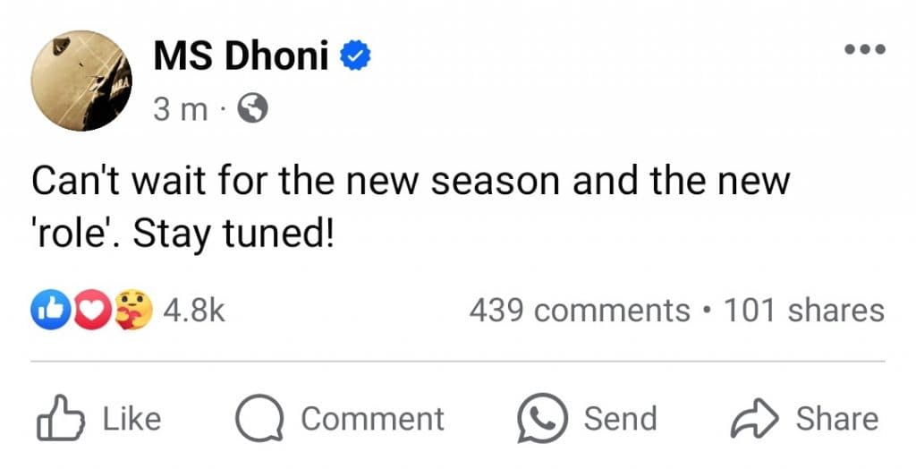 जैसे ही एमएस धोनी (MS Dhoni) ने कहा कि उनकी ‘नई भूमिका’ होगी यह पोस्ट कुछ ही मिनटों में वायरल हो गई. इस पोस्ट के बाद अटकलें शुरू हो गईं कि एमएस धोनी सीएसके के कोच बन सकते हैं या मेंटोर. पोस्ट पर कमेंट करते हुए उन्होंने लिखा कि उम्मीद है कि आप इस सीजन में कोचिंग करेंगे. एक दूसरे ने कहा कि नई ‘भूमिका का मतलब? क्या आप मेंटर के रूप में भी काम करेंगे. एक अन्य यूजर ने लिखा कि आप जरूर संन्यास लेने वाले हैं और नये कप्तान की घोषणा करेंगे.