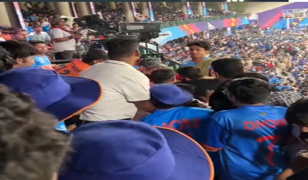 भारत और अफगानिस्तान वर्ल्ड कप मैच में जब रोहित शर्मा तूफानी बल्लेबाजी कर रहे थे, उसी समय दर्शक दीर्घा में दर्शकों के बीच किसी बात को लेकर बहस शुरू हो गई. बात बढ़ते-बढ़ते हाथापाई तक पहुंच गई. इसका वीडियो अब सोशल मीडिया में तेजी से वायरल हो रहा है. बताया जा रहा है कि रोहित शर्मा और एमएस धोनी के फैन्स ने विराट कोहली के फैन्स की जमकर कुटाई कर दी.