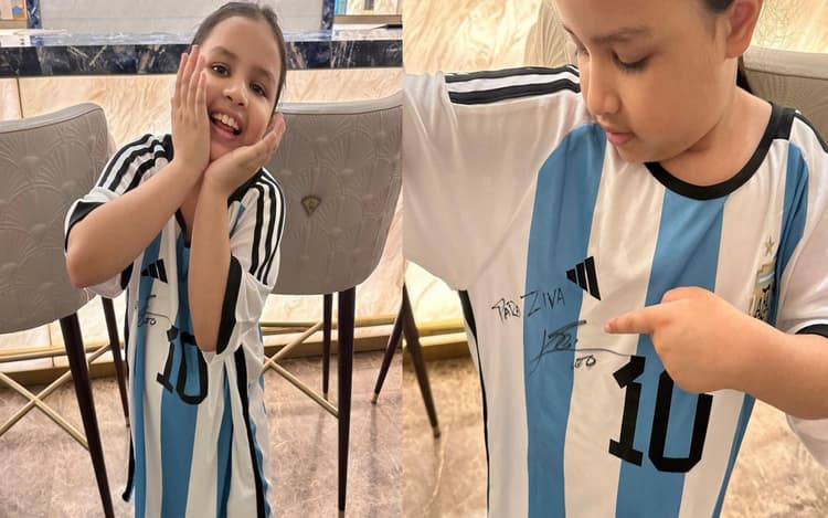 MS Dhoni Daughter: फीफा वर्ल्ड कप 2022 चैंपियन अर्जेंटीना के कप्तान लियोलन मेसी ने महेंद्र सिंह धोनी की बेटी जीवा को अपनी साइन की हुई जर्सी भेंट की. जीवा धोनी (Ziva Dhoni) भी मेसी की फैन है और अर्जेंटीना की जीत का जश्न मना रही हैं. धोनी की पत्नी साक्षी ने मंगलवार को अपने इंस्टाग्राम अकाउंट पर बेटी जीवा की तस्वीर शेयर की है. इस तस्वीर में जीवा अर्जेंटीना की जर्सी पहने बेहद खुश नजर आ रही हैं, जिस पर मेसी का ऑटोग्राफ भी है.
