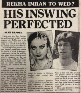 आपको यह सुन के थोड़ा अजीब लग रहा होगा कि पाकिस्तानी क्रिकेटर और रेखा की लव स्टोरी, क्योकिं अब तक आपने बॉलीवुड शंहशाह अमिताभ बच्चन और रेखा के ही प्रेम कहानियों के किस्से सुने होंगे. पर यह सच है कि बॉलीवुड एक्ट्रेस रेखा और इमरान खान के बीच नजदीकियां थीं. यह जानकारी एक इंस्टाग्राम यूजर की ओर से पोस्ट की गई अखबार की कटिंग पोस्ट से सामने आई है. यह पोस्ट अक्टूबर 2020 की है लेकिन अभी फिर से सुर्खियों में हैं. पोस्ट में जो कटिंग डाली गई है वह स्टार न्यूजपेपर की है और 1985 के समय की है.