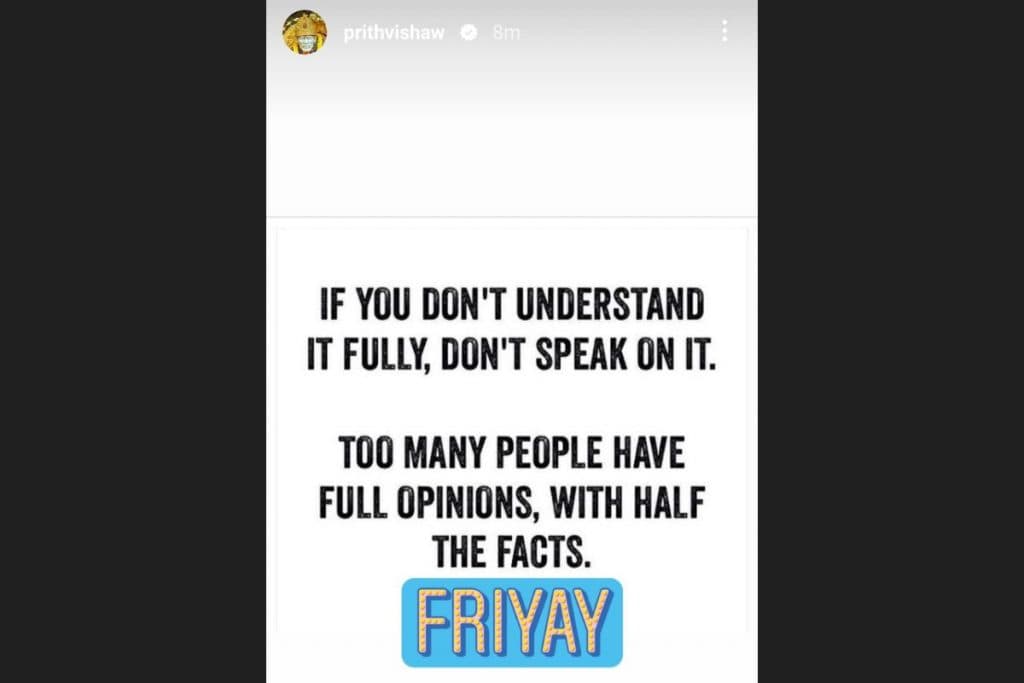 बैट्समैन पृथ्वी शॉ ने शुक्रवार शाम को सोशल मीडिया पर पोस्ट किया. उन्होंने कहा, “अगर आप इसे पूरी तरह से नहीं समझते हैं तो इस पर बात न करें. बहुत सारे लोगों के पास आधी जानकारी होती है लेकिन ओपीनियन की पूरी होती है. फ्राइडे.” हालांकि पृथ्वी ने यह किसके लिए कहा है, यह स्पष्ट नहीं हो रहा. लेकिन यह माना जा सकता है, कि उन पर की गई टिप्पणी के बाद यह रिएक्शन आया है.