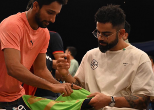 बता दें कि मोहम्मद अजहरुद्दीन ने सोशल मीडिया साइट पर विराट के साथ जो तसवीर शेयर की है, उसमें साफ-साफ देखा जा सकता है कि वह युवा बल्लेबाज ने अपने आदर्श कोहली से ने आरसीबी की हरी जर्सी पर विराट कोहली का आटोग्राफ लिया. फोटो को सोशल मीडिया पर पोस्ट करते हुए जहरुद्दीन ने कैप्शन लिखा, ‘इस जर्सी को फ्रेम कराकर रखूंगा. बता दें कि इस मैसेज को सोशल मीडिया पर लोगो द्वारा काफी पंसद किया जा रहा है.