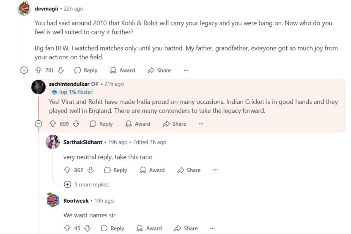 सत्र के दौरान एक यूजर ने तेंदुलकर से पुराने इंटरव्यू की याद दिलाई, जब उन्होंने कहा था कि विराट कोहली और रोहित शर्मा उनकी विरासत को आगे बढ़ाएंगे. इस पर मास्टर ब्लास्टर ने मुस्कुराते हुए कहा “हां! विराट और रोहित ने कई मौकों पर भारत को गर्व महसूस कराया है. भारतीय क्रिकेट सुरक्षित हाथों में है और इंग्लैंड में उनका प्रदर्शन शानदार रहा. कई खिलाड़ी हैं जो भविष्य में इस विरासत को आगे ले जा सकते हैं.”