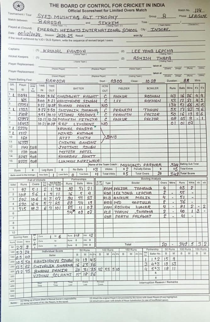 पहले बल्लेबाजी करने उतरी बड़ौदा की टीम को शानदार शुरुआत मिली. शाश्वत रावत और अभिमन्यु सिंह ने पहले विकेट के लिए 92 रनों की बड़ी साझेदारी की. शाश्वत ने 16 गेंदों पर 43 रन बनाए, जबकि अभिमन्यु ने 17 गेंदों पर 53 रन बनाकर अपना अर्धशतक पूरा किया. यह भानु पनिया के लिए एक शानदार मैच साबित हुआ. उन्होंने 51 गेंदों पर 5 चौकों और 15 छक्कों की मदद से नाबाद 134 रन बनाए. उन्होंने 262.75 की स्ट्राइक रेट के साथ शतक जड़ा. सिक्किम के गेंदबाज बड़ौदा के बल्लेबाजों के आगे पूरी तरह से बेबस नजर आए. बड़ौदा के लिए शिवालिक शर्मा ने 17 गेंदों पर 55 रन बनाए, जबकि विष्णु सोलंकी ने सिर्फ 16 गेंदों पर अर्धशतक जड़कर टीम के स्कोर को 349 पर पहुंचाया.