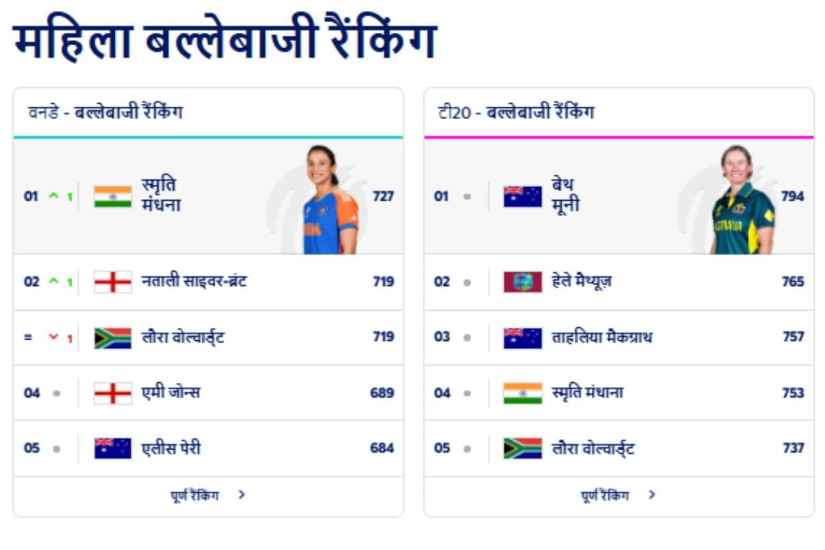 स्मृति मंधाना पिछले कई वर्षों से निरंतर प्रदर्शन कर रही हैं और टॉप-10 में उनका नाम लगातार बना रहा है. लेकिन 2019 के बाद पहली बार वह फिर से शिखर पर पहुंचीं, जो उनकी निरंतरता और हालिया फॉर्म का प्रमाण है. उन्होंने श्रीलंका और दक्षिण अफ्रीका के खिलाफ कोलंबो में हुई त्रिकोणीय श्रृंखला के फाइनल में शानदार शतक जमाया, जिससे उनकी रैंकिंग में महत्वपूर्ण सुधार हुआ.