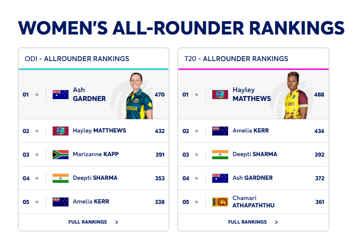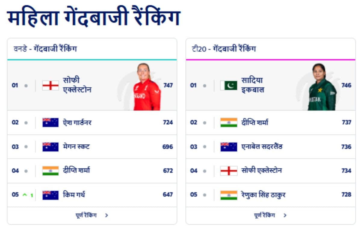 वनडे क्रिकेट में नंबर 1 पर ऑस्ट्रेलिया की एश्ले गार्डनर हैं, जबकि दीप्ति शर्मा यहां भी चौथे नंबर हैं. वहीं टी20 क्रिकेट में हैली मैथ्यूज 488 रेटिंग के साथ पहले पायदान पर हैं, दीप्ति शर्मा 392 रेटिंग के साथ तीसरे स्थान पर हैं.