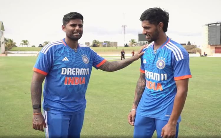 Suryakumar Yadav And Tilak Varma Chat Video: लगातार दो मैचों में हार के बाद टीम इंडिया ने मंगलवार को गुयाना में तीसरे टी20 मैच में वेस्टइंडीज के खिलाफ 7 विकेट से जीत दर्ज कर पांच मैचों की सीरीज में अपनी उम्मीदों को बरकरार रखा. मैच में विंडीज टीम ने पहले बैंटिग करते हुए भारत को जीत के लिए 160 रनों का लक्ष्य दिया, जिसे टीम इंडिया ने आसानी से हासिल कर लिया. भारत के इस जीत के हीरो सूर्यकुमार यादव और तिलक वर्मा रहे. सूर्यकुमार ने 83 रनों की तूफानी पारी खेली, जबकि तिलक ने नाबाद 49 रन बनाए. सूर्या को ‘प्लेयर ऑफ द मैच’ भी चुना गया. वहीं मैच के बाद सूर्यकुमार ने तिलक के साथ बातचीत में बताया कि वह इस इरादे के साथ बल्लेबाजी करने मैदान पर नहीं उतरे थे.