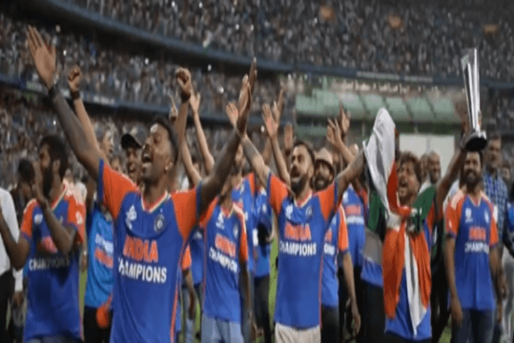 Maa Tujhe Salaam: भारतीय टीम गुरुवार (4 जुलाई) को भारत वापस आ गई है. भारतीय टीम के घर वापसी पर पूरे देश में जश्न का माहौल है. जहां टीम इंडिया का दिल्ली वालों ने दिल से वहीं मुंबई वालों ने मोहब्बत से स्वागत किया. भारतीय फैंस ने टीम की खातिरदारी में कोई कमी नहीं छोड़ी. दिल्ली पहुंचने के थोड़ी देर बाद सभी खिलाड़ी और स्पोर्ट्स स्टाफ पीएम मोदी से मिलने उनके आवास पर पहुंचे. जिसके बाद सभी वहां से सीधे मुंबई रवाना हो गए. जहां सभी को भारतीय दर्शक के साथ विक्ट्री परेड निकालनी थी. विक्ट्री परेड करते हुए भारतीय टीम वानखेड़े स्टेडियम पहुंची. जहां टीम का भव्य स्वागत किया गया. यह सभी पल बहुत खास थे. अब बीसीसीआई ने एक वीडियो शेयर किया, जिसमें विराट कोहली, रोहित शर्मा और हार्दिक पांड्या ‘मां तुझे सलाम’ गाना गाते हुए नजर आ रहे हैं.