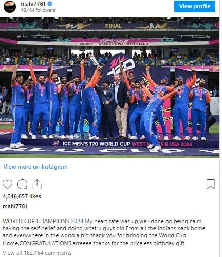 महेंद्र सिंह धोनी ने सोशल मीडिया प्लेटफार्म इंस्टाग्राम पर लिखा कि वर्ल्ड कप चैम्पियन 2024… मेरी दिल की धड़कनें तेज हो चुकी थी. शांतिचित्त होकर, आत्मविश्वास बनाये रखकर शानदार प्रदर्शन टीम इंडिया ने किया. देश में और दुनिया भर में सभी भारतीयों की ओर से वर्ल्ड कप घर लाने की बधाई…जन्मदिन के शानदार गिफ्ट के लिये थैंक्स…