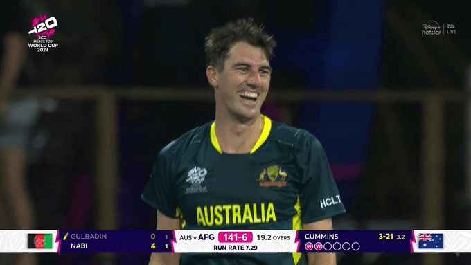 31 वर्षीय कमिंस ने शुरुआत अपने तीसरे ओवर की आखिरी गेंद पर अफ़गानिस्तान के कप्तान राशिद खान को आउट करके की. इसके बाद उन्होंने पारी के आखिरी ओवर में करीम जनत और गुलबदीन नाइब को लगातार गेंदों पर आउट किया. इस शानदार प्रदर्शन ने न केवल टूर्नामेंट में उनकी दूसरी हैट्रिक हासिल की, बल्कि ऑस्ट्रेलिया को खेल में वापसी करने में भी मदद की, जिसने 16वें ओवर में अफ़गानिस्तान को 118-1 से 148-6 पर रोक दिया.