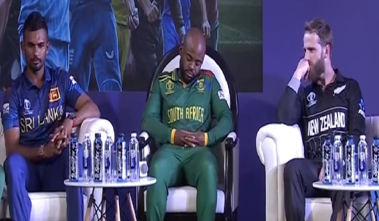 इंग्लैंड और न्यूजीलैंड के बीच मुकाबले के साथ वर्ल्ड कप 2023 (ICC World Cup 2023) का आगाज हो चुका है. इस मुकाबले की पूर्व संध्या पर सभी 10 टीमों के कप्तान अहमदाबाद के नरेंद्र मोदी स्टेडियम में एक साथ मिले और फोटो खिंचाई. इस मौके पर सभी कप्तानों ने संयुक्त रूप से प्रेस कॉन्फ्रेंस किया. कैप्टंस मीट से जुड़ी कई वीडिया और फोटो सोशल मीडिया पर शेयर की जा रही हैं. जिसमें दक्षिण अफ्रीका के कप्तान तेंबा बावुमा मंच पर सोते दिख रहे हैं. अब इसको लेकर सोशल मीडिया पर जमकर मीम्स बनाए जा रहे हैं.