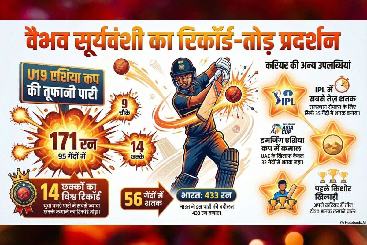 अपनी इस शानदार पारी के दौरान, सूर्यवंशी ने युवा वनडे में एक ही पारी में सबसे अधिक छक्के लगाने का विश्व रिकॉर्ड भी तोड़ दिया. उनके इस प्रदर्शन के दम पर उन्होंने ऑस्ट्रेलिया के माइकल हिल का रिकॉर्ड तोड़ा, जिन्होंने 2008 में नामीबिया अंडर-19 के खिलाफ खेलते हुए 12 छक्के लगाए थे. बिहार के समस्तीपुर के रहने वाले और इंडियन प्रीमियर लीग (IPL) में राजस्थान रॉयल्स के लिए खेलने वाले सूर्यवंशी, अपने करियर में 50 से अधिक युवा वनडे छक्के लगाने वाले खेल के इतिहास में पहले खिलाड़ी भी बन गए हैं.
