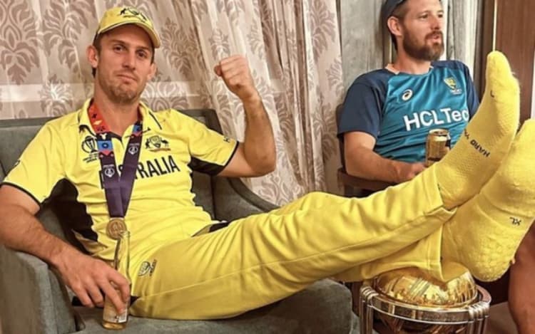 विश्व कप 2023 का फाइनल मुकाबला भारत बनाम ऑस्ट्रेलिया 19 नवंबर को खेला गया. भारत को इस फाइनल मुकाबले में करारी हार का सामना करना पड़ा. भारत के द्वारा दिए गए 241 रनों के लक्ष्य का पीछा करने में ऑस्ट्रेलिया की टीम कामयाब रही. ऑस्ट्रेलिया ने अपने चार बल्लेबाजों को खोकर इस मुकाबले को अपने नाम किया. मुकाबले के बाद ऑस्ट्रेलिया के ऑल राउंडर मिचेल मार्श ने ट्रॉफी के साथ एक तस्वीर सोशल मीडिया पर उपलोड की जिसको देखकर भारतीय फैंस का गुस्सा उबल पड़ा. सोशल मीडिया पर सामने आई एक तस्वीर में इस वेस्ट ऑस्ट्रेलियाई खिलाड़ी को ट्रॉफी पर अपने पैर रखकर बैठे हुए देखा गया और क्रिकेट फैंस इसकी कड़ी आलोचना कर रहे हैं.
