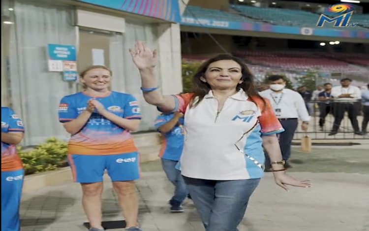 Neeta Ambani and MI Team Dance after Win Over UP Warriors: विमेंस प्रीमियर लीग के दो फाइनलिस्ट पक्के हो गए हैं. पहले सीजन का फाइनल मुकाबला दिल्ली कैपिटल्स और मुंबई इंडियंस के बीच खेला 26 मार्च को खेला जाएगा. शुक्रवार को खेले गए एलिमिनेटर मुकाबले में मुंबई ने यूपी वॉरियर्स को 72 रनों से हराकर फाइनल की टिकट पक्का कर लिया. वहीं इस जीत के बाद टीम के खिलाड़ी और मालकिन नीता अंबानी जमकर जश्न मनाते और डांस करते हुए नजर आईं. अब नीता अंबानी और टीम के डांस का वीडियो सोशल मीडिया पर तेजी से वायरल हो रहा है.