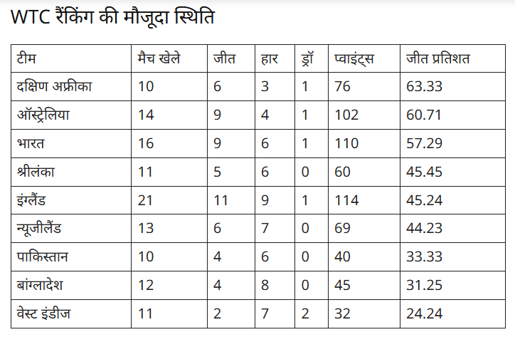 WTC: भारत और ऑस्ट्रेलिया के बीच दूसरे टेस्ट में हार और द. अफ्रीका की श्रीलंका के विरुद्ध जीत के बाद भारत WTC प्वाइंट्स टेबल में तीसरे स्थान पर खिसक गया है. भारत को लॉर्ड्स में होने वाले फाइनल में पहुंचने के लिए विकल्प काफी सीमित हैं. देखिए पूरा समीकरण