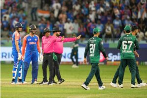 एशिया कप 2025 का विवाद और भी ज्यादा चर्चा में रहा. मेजबान भारत होने के बावजूद टूर्नामेंट यूएई में खेला गया. पहलगाम आतंकी हमले के बाद टीम इंडिया ने फैसला किया कि वह पाकिस्तानी खिलाड़ियों से हाथ नहीं मिलाएगी. टॉस के समय भारतीय कप्तान सूर्यकुमार यादव (Suryakumar Yadav) ने पाक कप्तान सलमान आगा (Salman Agha) की ओर बढ़े हाथ को नजरअंदाज किया. यह दृश्य सोशल मीडिया पर तेजी से वायरल हो गया. पाकिस्तान ने इसे खेल भावना के खिलाफ बताया और आईसीसी में शिकायत भी की. लेकिन नियमों में ऐसी किसी मनाही का जिक्र नहीं होने के कारण शिकायत खारिज हो गई. इसके बाद मैदान पर दोनों टीमों के बीच तनाव और बढ़ गया.