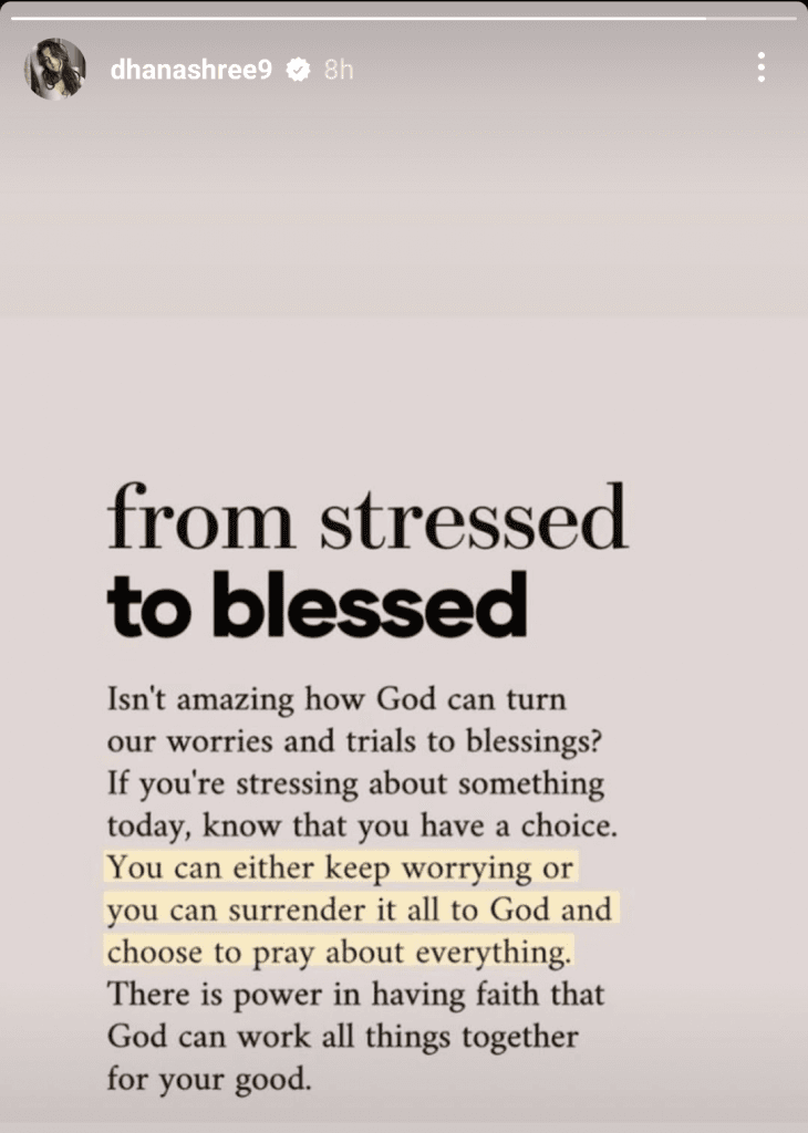 युजवेंद्र चहल की स्टोरी के करीब 1 घंटे बाद धनश्री वर्मा ने भी इंस्टाग्राम पर एक स्टोरी शेयर की. इस दौरान उन्होंने लिखा कि स्ट्रेस सौभाग्यशाली होने तक. उन्होंने स्टोरी शेयर करते हुए लिखा कि भगवान कैसे चिंताओं को खुशियों में बदल देते हैं, ये कितना अच्छा है. अगर आप किसी चीज को लेकर चिंतित हैं, तो आप जान लीजिए की आपके पास विकल्प हैं. ऐसे में आप या तो चिंतित हो सकते हैं या फिर भगवान को समर्पित कर सकते हैं.