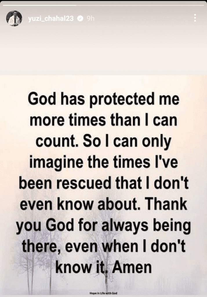 युजवेंद्र चहल ने सोशल मीडिया प्लेटफॉर्म इंस्टाग्राम पर एक स्टोरी शेयर किया था. इस दौरान उन्होंने लिखा कि मैं जितना बच सकता हूं भगवान ने मुझे उससे ज्यादा बचाया है. उन्होंने साथ होने के लिए भगवान को धन्यवाद किया. उन्होंने लिखा कि जब मुझे पता भी नहीं होता कि आप मेरे साथ हैं.