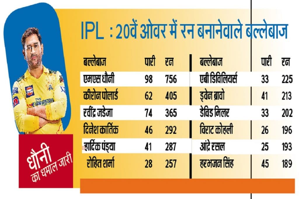 20वें ओवर की बात करें, तो महेंद्र सिंह धौनी 98 पारियों में 756 से अधिक रन बना चुके हैं. दूसरे स्थान पर कीरोन पोलार्ड हैं. पोलार्ड ने 62 पारियों में 405 रन बनाये हैं. चेन्नई सुपर किंग्स के स्टार ऑलराउंडर रवींद्र जडेजा का भी 20वें ओवर में जलवा रहा है. रवींद्र जडेजा ने 74 पारियों में 365 रन बनाये हैं.