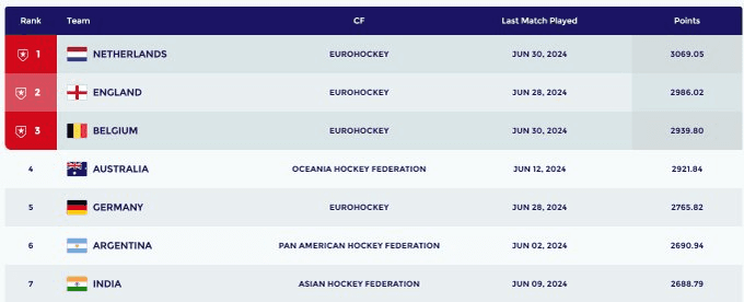 नीदरलैंड वर्तमान में 3069.05 अंकों के साथ विश्व रैंकिंग में शीर्ष स्थान पर है, उसके बाद इंग्लैंड 2968.02 अंकों के साथ दूसरे और बेल्जियम 2939.80 अंकों के साथ तीसरे स्थान पर है. भारत वर्तमान में 2688.79 अंकों के साथ सातवें स्थान पर है.