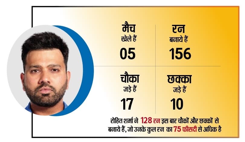 रोहित ने आइपीएल के इस सत्र में मुंबई इंडियंस की ओर से पांच मैचों में 156 रन बनाये हैं. इस दौरान 17 चौके और 10 छक्कों की मदद से 128 रन बनाये हैं, जो उनके कुल रन का 75 फीसदी से अधिक है.