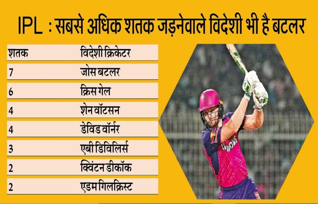 आईपीएल में लक्ष्य का पीछा करते हुए सबसे अधिक सेंचुरी लगाने का रिकॉर्ड भी इंग्लैंड के दिग्गज क्रिकेटर बटलर के नाम हैं. उन्होंने तीन शतक जड़े हैं. आरसीबी की ओर से विराट कोहली और बेन स्टोक्स ने आइपीएल में टारगेट का पीछा करते हुए दो-दो शतक बनाये हैं. विदेशी क्रिकेटर के तौर पर बटलर ने आईपीएल में सबसे अधिक सात शतक जड़े हैं. क्रिस गेल छह शतक लगा कर दूसरे स्थान पर हैं.
