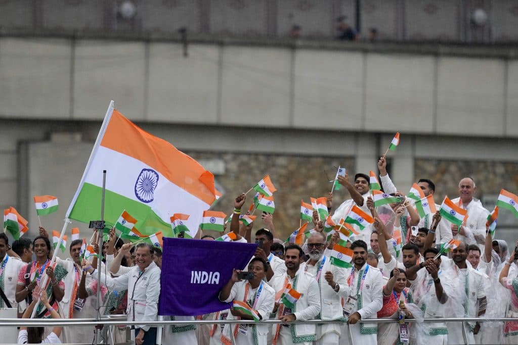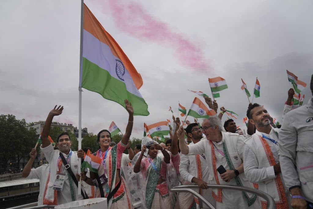 फ्रांस की वर्णमाला के क्रम के अनुसार टीमों का आगमन हुआ. पहले ओलंपिक खेलों के जनक यूनान का दल आया जिसके बाद शरणार्थी टीम आई. मेजबान फ्रांस का दल सबसे आखिर में आया जिसका प्रशंसकों ने जबर्दस्त करतल ध्वनि से स्वागत किया. भारतीय दल की अगुवाई दो ध्वजवाहकों दो बार की ओलंपिक पदक विजेता पी वी सिंधू और टेबल टेनिस दिग्गज अचंत शरत कमल ने की. भारतीय दल 84वें नंबर पर आया. महिला खिलाड़ियों ने राष्ट्रीय ध्वज के तीन रंगों से बनी साड़ी और पुरूषों ने कुर्ता पायजामा पहना था. भारत के 78 खिलाड़ियों और अधिकारियों ने इसमें भाग लिया.