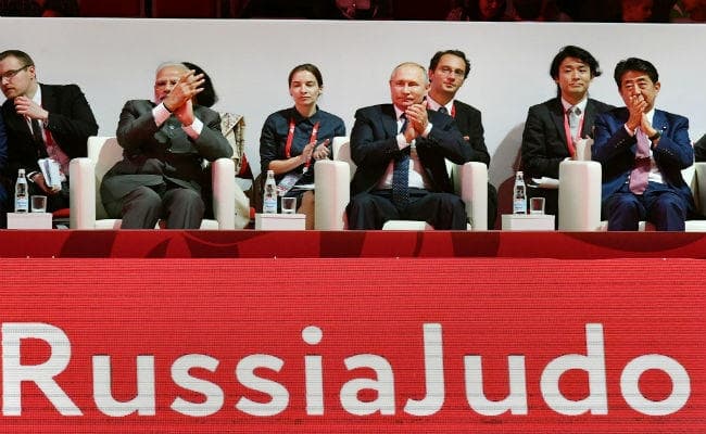 व्लादिवोस्तोक : प्रधानमंत्री नरेंद्र मोदी गुरुवार को रूस के राष्ट्रपति व्लादिमीर पुतिन और जापानी प्रधानमंत्री शिंजो आबे के साथ यहां अंतरराष्ट्रीय जूडो टूर्नामेंट देखने पहुंचे जहां उन्होंने भारतीय खिलाड़ियों के साथ बातचीत भी की.