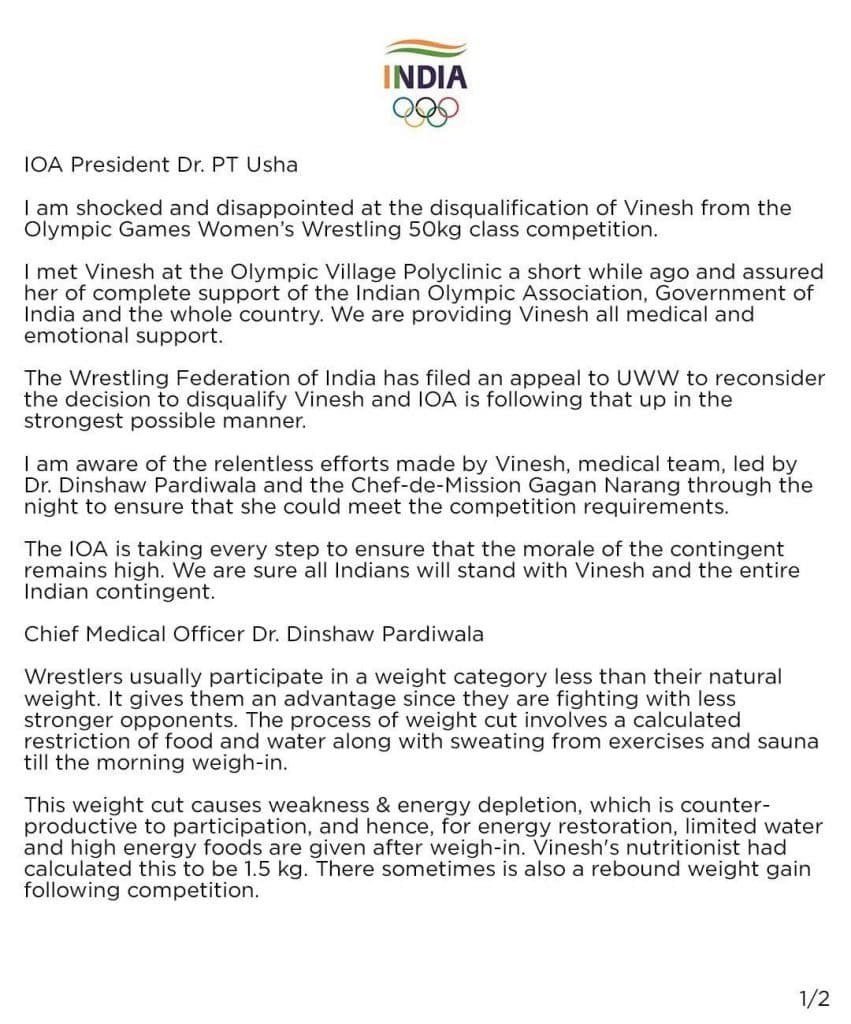 इंडियन ओलंपिक संघ की अध्यक्ष डॉ. पीटी उषा एक बयान जारी करते हुए कहती हैं- ओलंपिक खेलों की महिला कुश्ती 50 किग्रा वर्ग प्रतियोगिता से विनेश को अयोग्य ठहराए जाने से मैं स्तब्ध और निराश हूं। मैं कुछ समय पहले ओलंपिक विलेज पॉलीक्लिनिक में विनेश से मिली और उन्हें भारतीय ओलंपिक संघ, भारत सरकार और पूरे देश के पूर्ण समर्थन का आश्वासन दिया। हम विनेश को सभी चिकित्सा और भावनात्मक सहायता प्रदान कर रहे हैं।