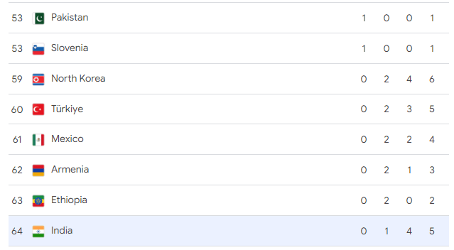 Paris Olympics medal tally: भारत 64वें स्थान पर है