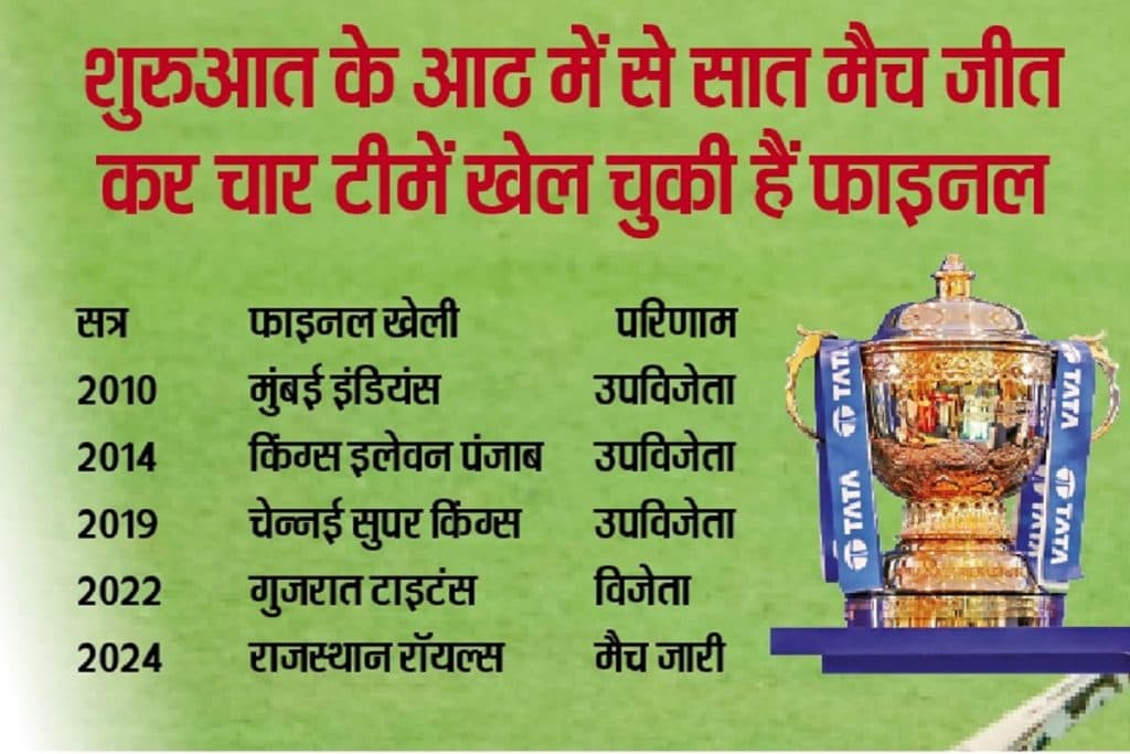 IPL 2024 में आधे से अधिक मैच खेले जा चुके हैं. राजस्थान रॉयल्स की टीम आठ में से सात मैच जीत कर अंक तालिका में शीर्ष पर बनी हुई है. राजस्थान की टीम अपने बचे छह में से दो मैच भी जीतने में सफल होती है, तो आइपीएल के प्लेऑफ के लिए क्वालीफाई कर लेगी, बटलर, संजू सैमसन की अगुआई में जिस तरह से राजस्थान रॉयल्स की टीम प्रदर्शन कर रही है, क्रिकेट के जानकार फाइनल का दावेदार मान रहे हैं. एक और भी कारण हैं, जिससे राजस्थान रॉयल्स टीम का फाइनल में पहुंचने की संभावना प्रबल होती दिखायी दे रही है. आईपीएल का यह 17वां संस्करण चल रहा है. राजस्थान की टीम आठ में से सात मैच जीतने में सफल रही है. जब-जब टीमों ने अपने शुरुआती आठ में से सात में जीत दर्ज की हैं, वह फाइनल खेली है. आईपीएल के शुरुआत के आठ मैचों की बात करें, तो मुंबई 2010 में सात मैच जीतने में सफल रही थी. 2014 में किंग्स इलेवन पंजाब (अभी पंजाब किंग्स) आठ में से सात जीता था. 2019 में चेन्नई सुपर किंग्स भी अपने शुरु के आठ मैचों में सात में सफलता दर्ज की थी. 2022 में गुजरात टाइटंस भी आठ में से सात मैचों में जीत दर्ज की थी. खास बात यह है कि शुरु के आठ में से सात मैच जीतनेवाली सभी टीमें फाइनल में पहुंचने में सफल रही थीं. हालांकि गुजरात की टीम ही खिताब जीतने में सफल रही थी, बाकी टीमों को फाइनल में हार का सामना करना पड़ा था.